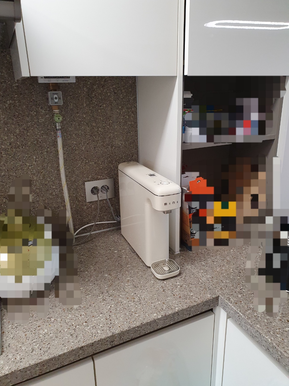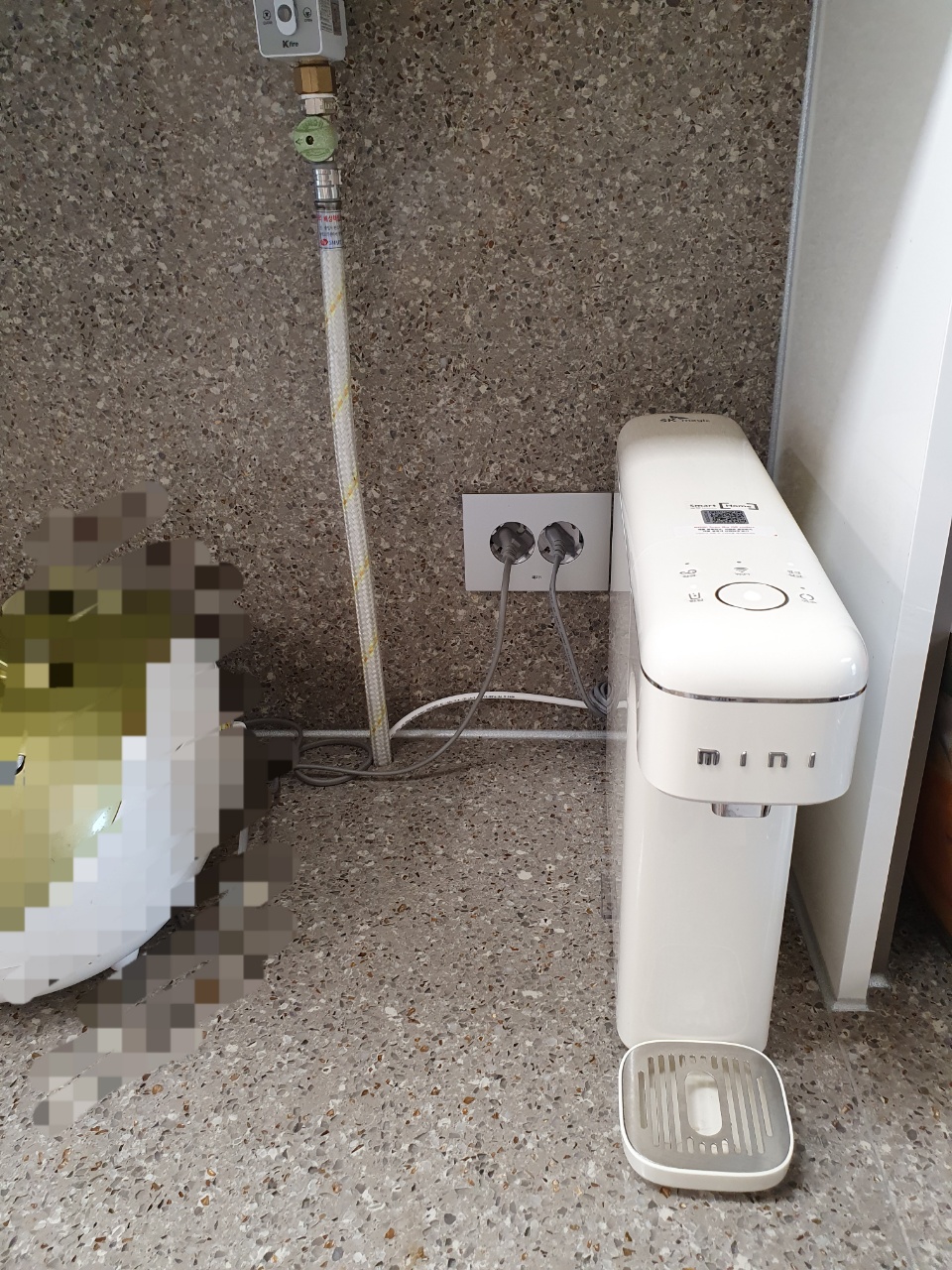 이름이 미니인 만큼 작아서 공간을 많이 차지하지 않아 좋다고 생각한다. 싱크대 상판 위에 올리면 호스를 연결해야 하는데 우리 집은 가스밸브 구멍에 같이 빼서 이동을 시켰으나 만약에 구멍이 없으면 설치기사님이 뚫어주는 경우도 많다고 한다. 설치 위치를 미리 가늠해보고 신청을 하는 것이 좋을 듯하다.