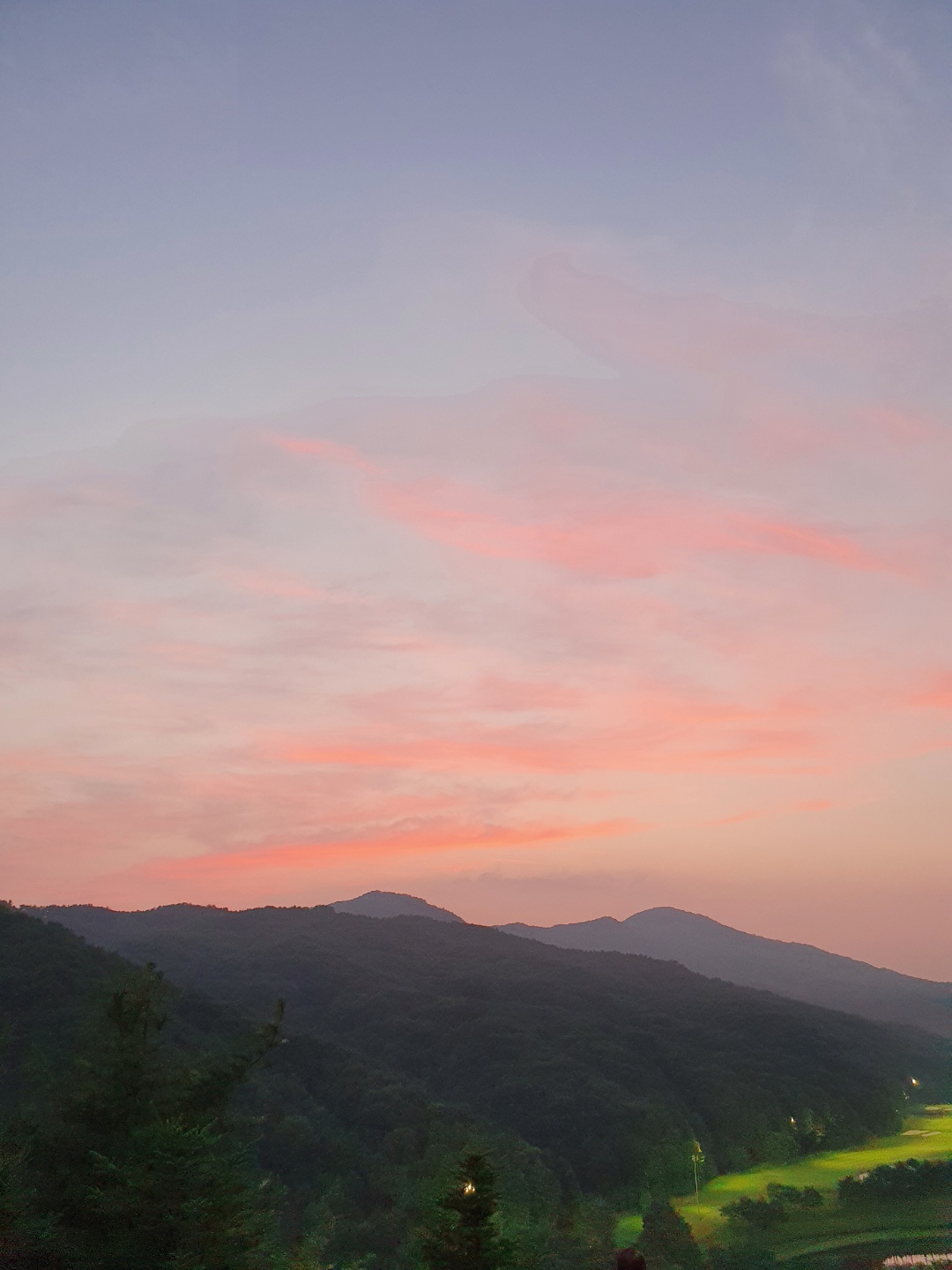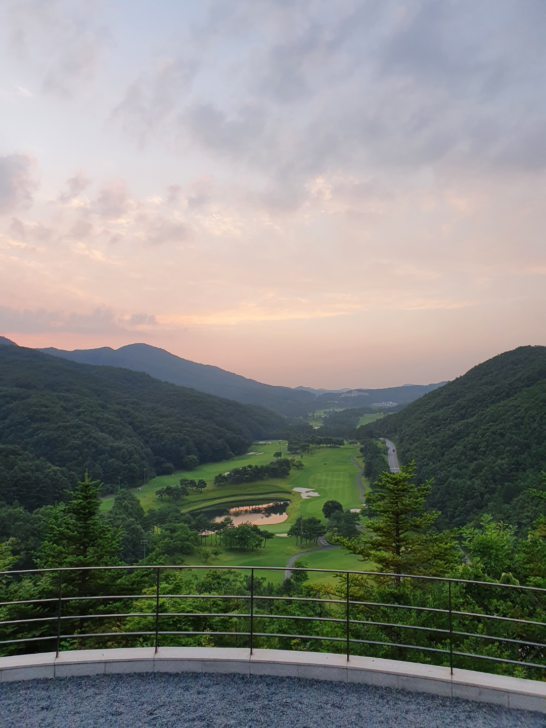 안에서는 사진을 찍을 수 없지만 호라이즌 룸 바깥으로 나갈 수 있는데 바깥에서는 사진을 찍을 수 있었다. 지대가 높아, 오크밸리 골프장과 해지는 모습을 담을 수 있었는데, 컬러풀나이트 프로그램에 이 뷰도 포함인 것 같다는 생각이 들 정도로 멋진 모습이었다. 호라이즌 룸에 뚫린 문을 통해 나가서 찍은 풍경들