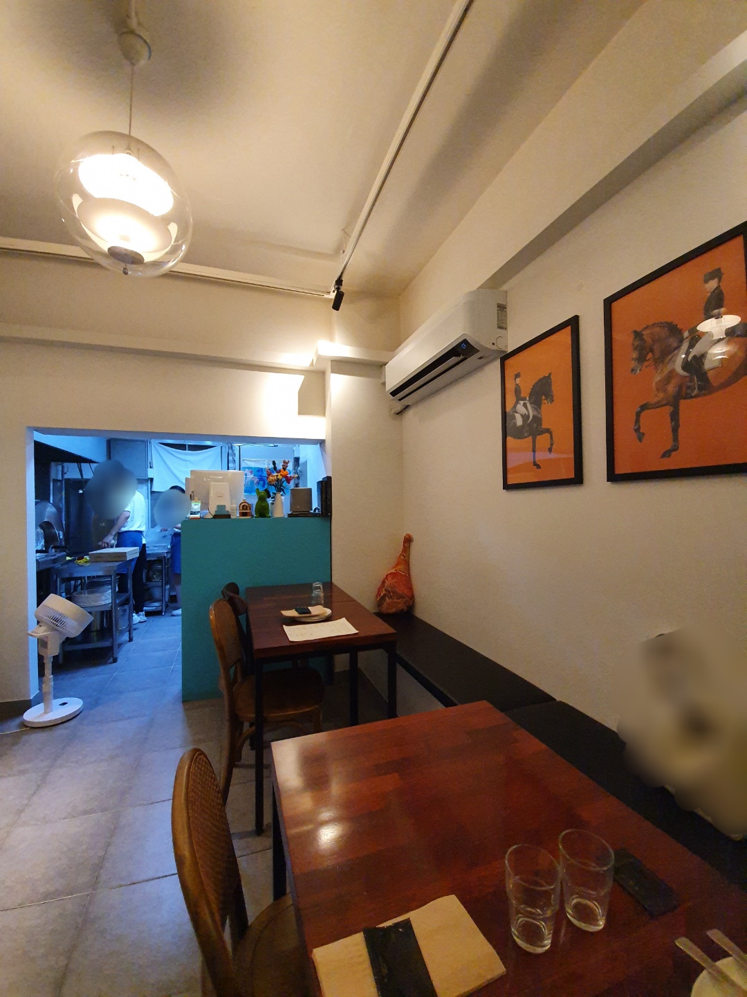 밤에 가서 어둡게 찍혀 잘 나오지 않았지만 가게는 조그맣고 아기자기하다. 동시에 수용할 수 있는 인원이 12~15명 정도밖에 안 되는 것 같다. 테이블이 많지 않다. 하지만 가게가 굉장히 청결하고 인테리어도 딱 적당한 수준으로 심플하게 되어 있다. 음악 선곡도 좋고 뱅앤올룹슨 스피커로 나오는 음질도 훌륭하다. 주방 안이 보이는 오픈 키친이어서 어떻게 요리하시는지 잘 보인다. 특히 화덕피자 굽는 모습은 아주 잘 보인다.