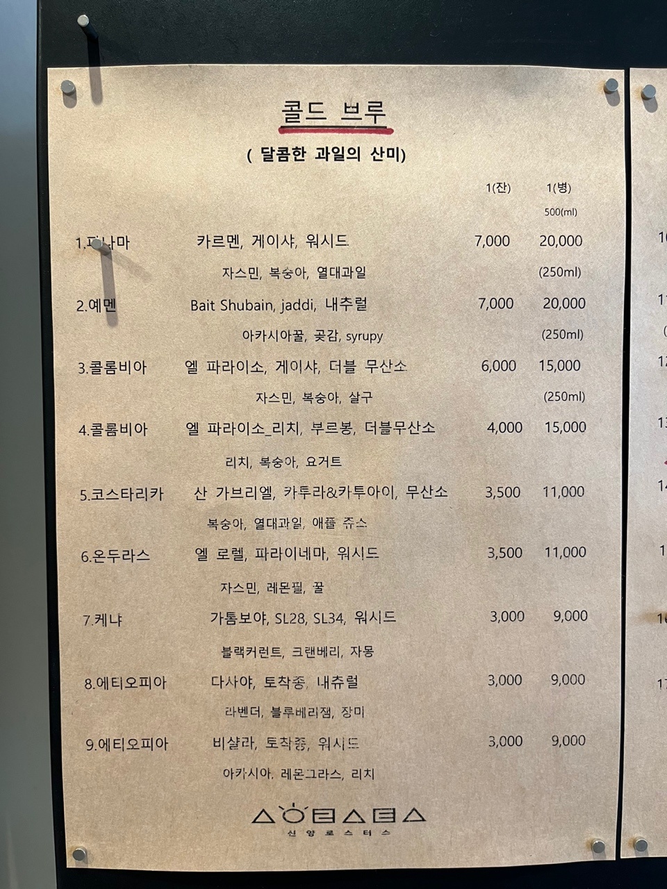 송리단길에 위치한 신양로스터스라는 커피집에 다녀왔다. 테이크아웃을 전문으로 하는 곳인데 커피 맛이 장난 아니다. 원두를 스마트스토어에서 팔기도 하고 콜드브루가 일품인데 가격이 너무 착하다. 송리단길에서 제대로 맛있는 커피를 마시고 싶다면 꼭 가보면 좋겠다.