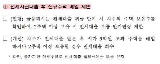 2019년 1216 대책에 따르면 시가 9억원 초과 주택을 매입하거나 2주택 이상 보유할 경우 전세대출이 회수된다고 한다. 시가 9억 이상 (통상 KB시세 기준)의 집을 보유할 경우 전세대출이 안 나오고 추가 매입하면 회수된다고 하는 엄청난 내용이었다. 그런데 추가 대책을 통해 이 부분은 더 강화되었다.