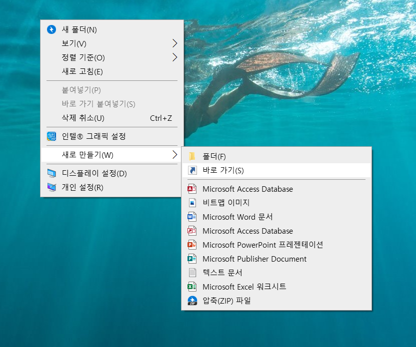 1. 바탕화면 빈 곳에 마우스 오른쪽 클릭을 하고 새로 만들기 - 바로가기 클릭 (바탕화면에서 빈 곳 아무 데나 마우스 우클릭을 하면 됨)