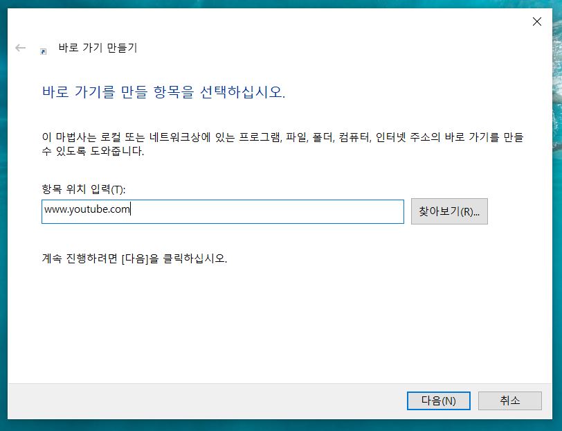 3. 바탕화면에 만들어질 바로가기의 이름을 지정해준다. 한글로 유튜브 또는 영어로 Youtube 아무거나 편한걸로 하면 된다. 마침을 누른다.