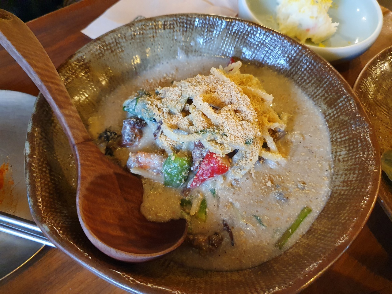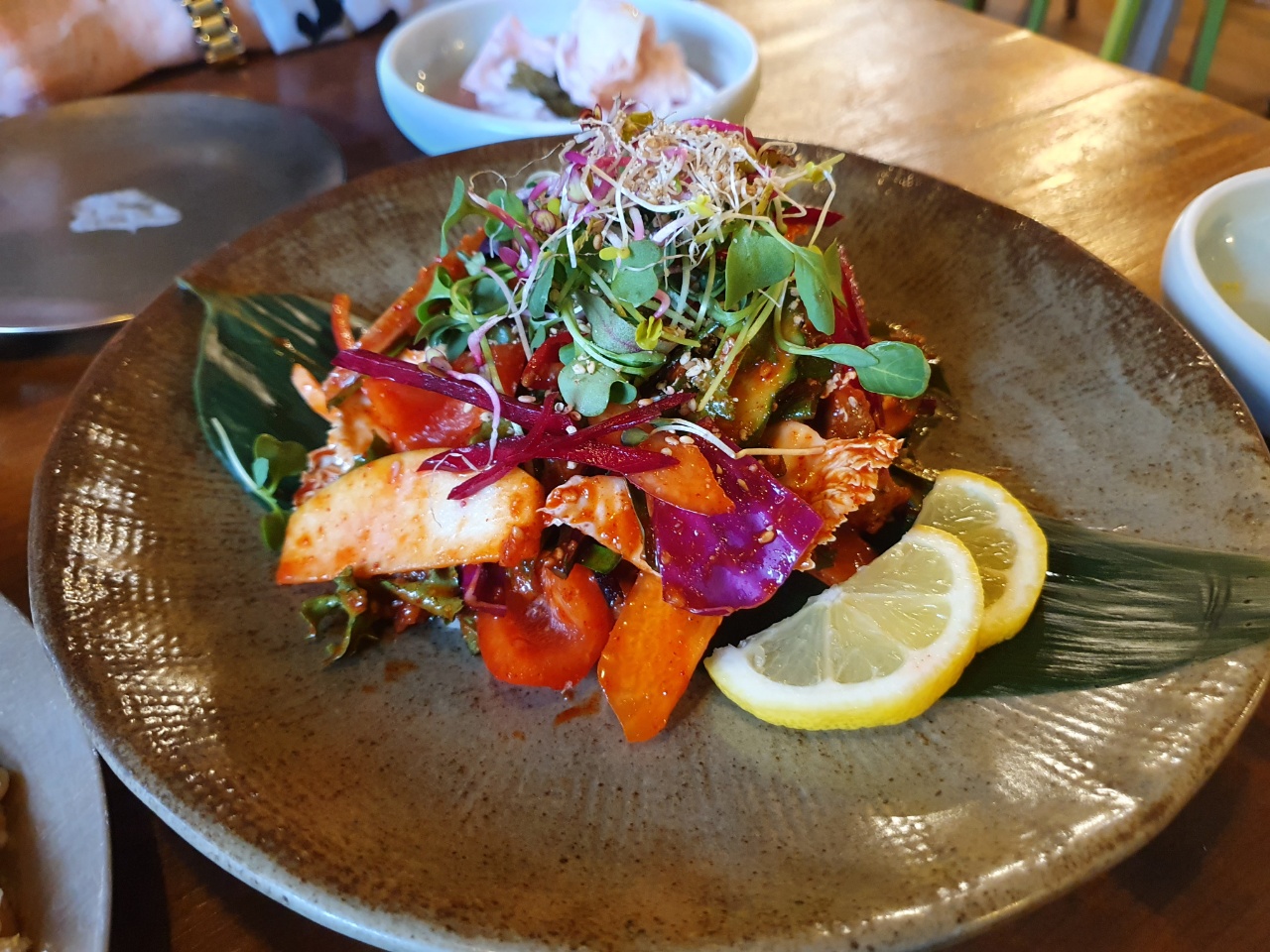 동래파전은 여기 파전 특징답게 굉장히 흐물흐물했고 평상시 보던 바삭한 느낌의 파전은 아니었다. 묽은 상태라서 먹기가 조금 힘들었는데 안에 들어가는 재료들이 좋아서 맛은 괜찮았다. (사람마다 호불호는 갈릴 듯하다.) 전통 동래파전 스타일이 이런 것인가 하는 생각이 들면서 한 번쯤은 먹어봐도 좋겠다는 맛이었다. 기타 요리들은 대부분 퓨전 한식과 같은 느낌이었는데 재료 본연의 맛을 잘 살린 메뉴들이었다. 특히 약초전병무침이랑 더덕구이가 맛있었고, 골뱅이 무침은 평범했고 동래 고동찜은 고동과 미나리가 잘 구분되지 않고 생소한 맛이어서 다소 아쉬웠다. 식사는 돌솥비빔밥을 선택했는데 맛은 괜찮았으나 마지막에 나와서 너무 배불러 제대로 즐기지 못했다.